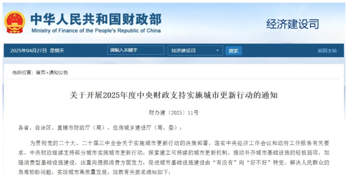 近日,財政部、住房城鄉建設部發布《關于開展2025年度中央財政支持實施城市更新行動的通知》。